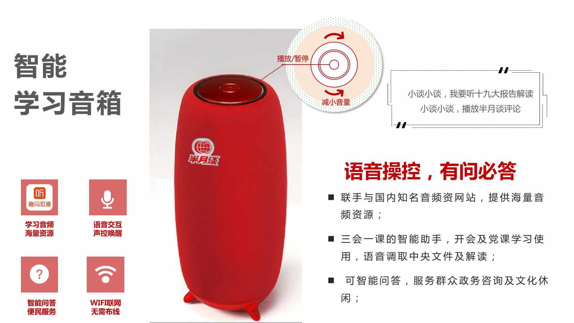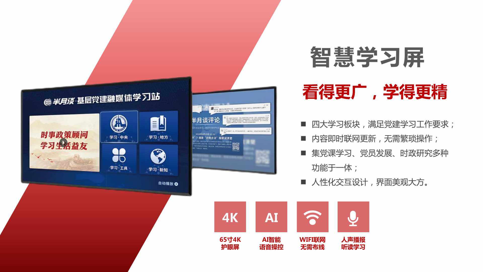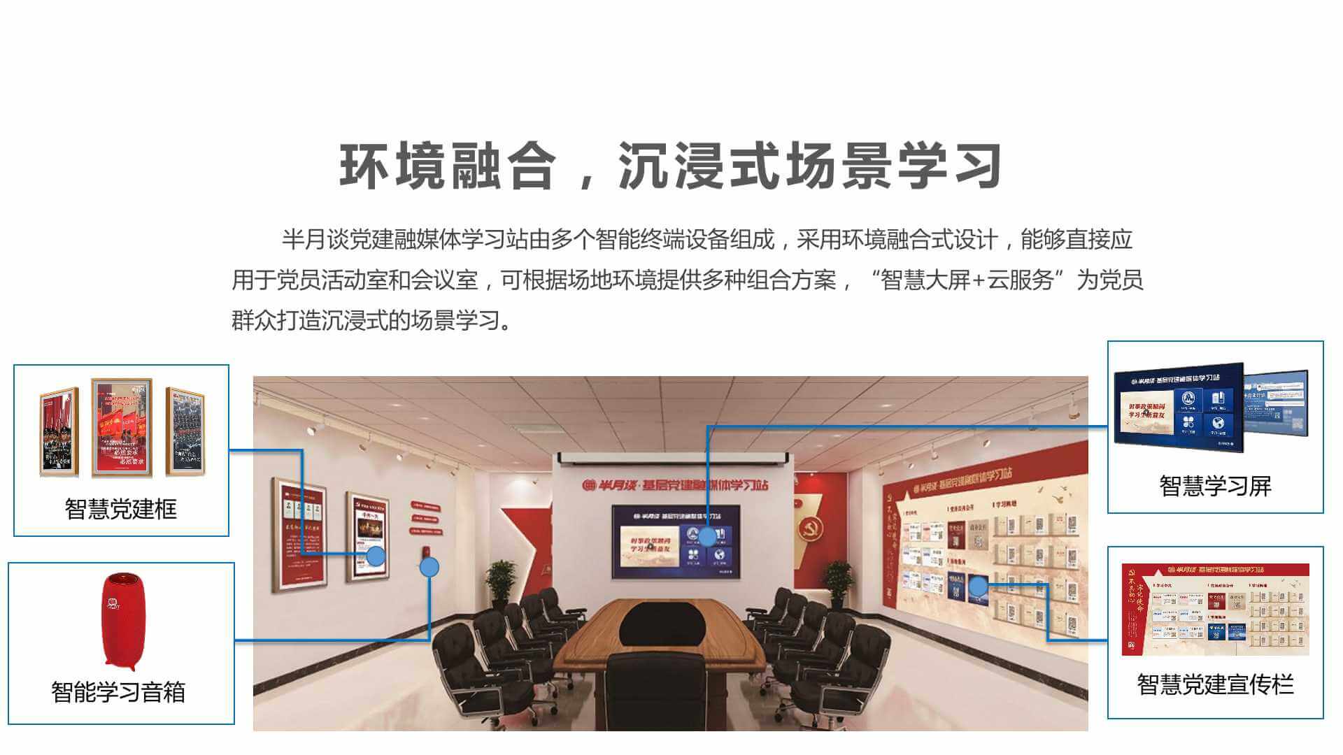半月谈党建融媒体学习站由多个智能终端设备组成,采用环境融合式设计,能够直接应用于党员活动室 和会议室,可根据场地环境提供多种组合方案,“智慧大屏+云服务”为党员群众打造沉浸式的场景学习。