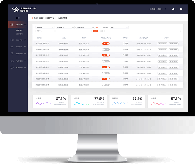 新时代文明实践中心管理平台,主要针对新时代文明实践中心全流程环节, 包括内容生产、内容发布、活动中心、项目中心、系统设置、组织管理、数据中心等功能,解决文明实践中心痛点。